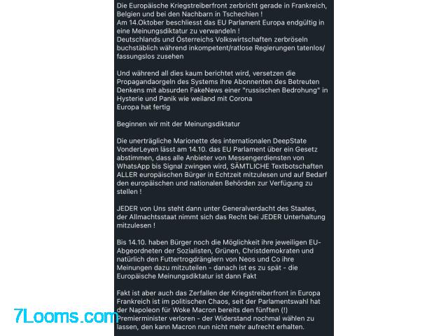 Die unerträgliche Marionette des internationalen DeepState VonderLeyen lässt am 14.10. das EU Parlament über ein Gesetz abstimmen, dass alle Anbieter von Messengerdiensten von WhatsApp bis Signal zwingen wird, SÄMTLICHE Textbotschaften ALLER europäischen Bürger in Echtzeit mitzulesen und auf Bedarf den europäischen und nationalen Behörden zur Verfügung zu stellen !