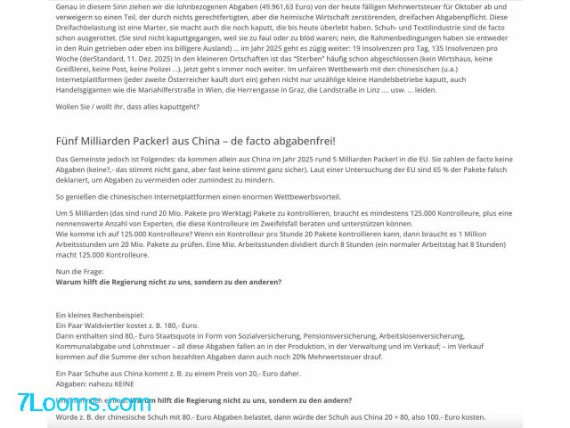 Genau in diesem Sinn ziehen wir die lohnbezogenen Abgaben (49.961,63 Euro) von der heute fälligen Mehrwertsteuer für Oktober ab und verweigern so einen Teil, der durch nichts gerechtfertigten, aber die heimische Wirtschaft zerstörenden, dreifachen Abgabenpflicht. Diese Dreifachbelastung ist eine Marter, sie macht auch die noch kaputt, die bis heute überlebt haben. Schuh- und Textilindustrie sind de facto schon ausgerottet. (Sie sind nicht kaputtgegangen, weil sie zu faul oder zu blöd waren; nein, die Rahmenbedingungen haben sie entweder in den Ruin getrieben oder eben ins billigere Ausland) … im Jahr 2025 geht es zügig weiter: 19 Insolvenzen pro Tag, 135 Insolvenzen pro Woche (derStandard, 11. Dez. 2025) In den kleineren Ortschaften ist das “Sterben” häufig schon abgeschlossen (kein Wirtshaus, keine Greißlerei, keine Post, keine Polizei …). Jetzt geht s immer noch weiter. Im unfairen Wettbewerb mit den chinesischen (u.a.) Internetplattformen (jeder zweite Österreicher kauft dort ein) gehen nicht nur unzählige kleine Handelsbetriebe kaputt, auch Handelsgiganten wie die Mariahilferstraße in Wien, die Herrengasse in Graz, die Landstraße in Linz …. usw. … leiden.