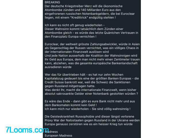 Der deutsche Kriegstreiber Merz will die ökonomische Atombombe zünden und 140 Milliarden Euro aus den eingefrorenen russischen Notenbankgeldern, die bei Euroclear liegen, mit einem "Kredittrick" endgültig stehlen !