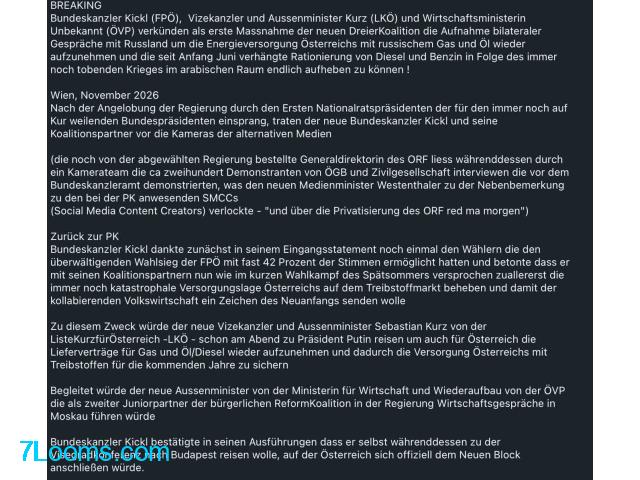 Bundeskanzler Kickl dankte zunächst in seinem Eingangsstatement noch einmal den Wählern die den überwältigenden Wahlsieg der FPÖ mit fast 42 Prozent der Stimmen ermöglicht hatten und betonte dass er mit seinen Koalitionspartnern nun wie im kurzen Wahlkampf des Spätsommers versprochen zuallererst die immer noch katastrophale Versorgungslage Österreichs auf dem Treibstoffmarkt beheben und damit der kollabierenden Volkswirtschaft ein Zeichen des Neuanfangs senden wolle