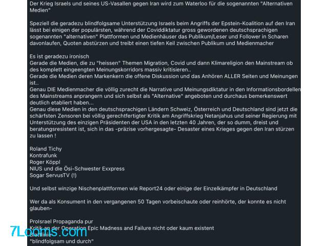 Speziell die geradezu blindfolgsame Unterstützung Israels beim Angriffs der Epstein-Koalition auf den Iran lässt bei einigen der populärsten, während der Coviddiktatur gross gewordenen deutschsprachigen sogenannten "alternativen" Plattformen und Medienhäuser das Publikum/Leser und Follower in Scharen davonlaufen, Quoten abstürzen und treibt einen tiefen Keil zwischen Publikum und Medienmacher