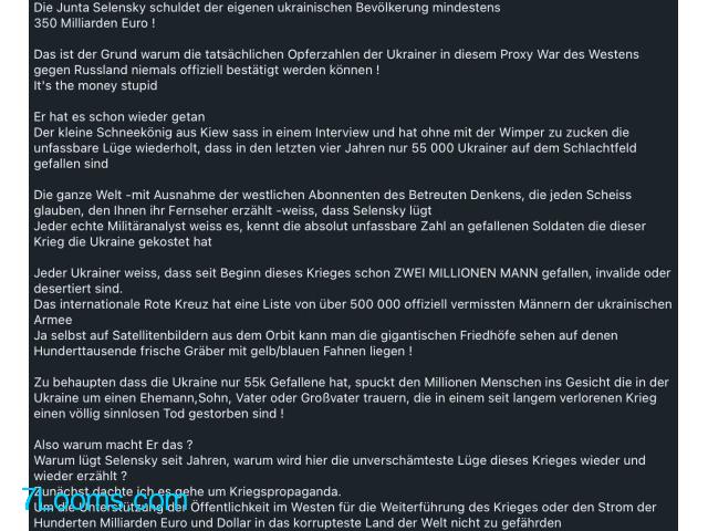 Zu behaupten dass die Ukraine nur 55k Gefallene hat, spuckt den Millionen Menschen ins Gesicht die in der Ukraine um einen Ehemann,Sohn, Vater oder Großvater trauern, die in einem seit langem verlorenen Krieg einen völlig sinnlosen Tod gestorben sind !