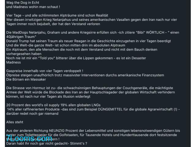Wer diesen irrwitzigen Krieg Netanjahus und seines amerikanischen Vasallen gegen den Iran nach nur vier Tagen immer noch bejubelt, der hat den Verstand verloren
