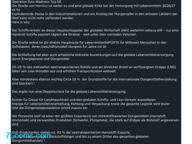Die Straße von Hormuz ist weiter zu und eine globale Krise bei der Versorgung mit Lebensmitteln 2026/27 ist fix