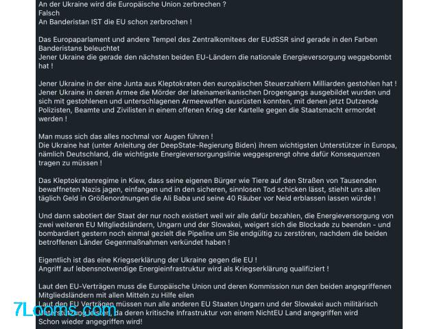 Und dann sabotiert der Staat der nur noch existiert weil wir alle dafür bezahlen, die Energieversorgung von zwei weiteren EU Mitgliedsländern, Ungarn und der Slowakei, weigert sich die Blockade zu beenden - und bombardiert gestern noch einmal gezielt die Pipeline um Sie endgültig zu zerstören, nachdem die beiden betroffenen Länder Gegenmaßnahmen verkündet haben !
