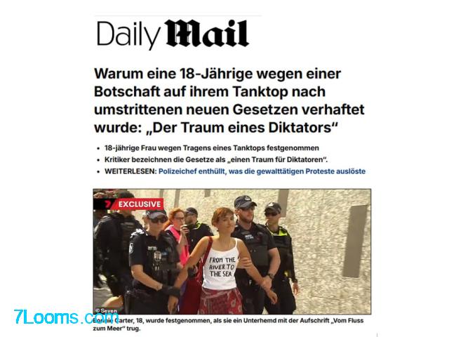 Kostenlos „From the river to the sea“ 18-Jährige wegen Aufschrift auf Tanktop in Brisbane festgenommen. ; Brisbane