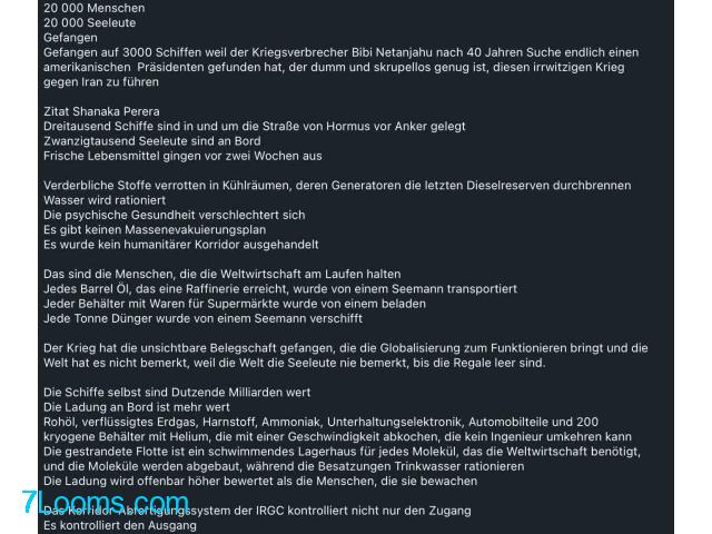 Gefangen auf 3000 Schiffen weil der Kriegsverbrecher Bibi Netanjahu nach 40 Jahren Suche endlich einen amerikanischen Präsidenten gefunden hat, der dumm und skrupellos genug ist, diesen irrwitzigen Krieg gegen Iran zu führen