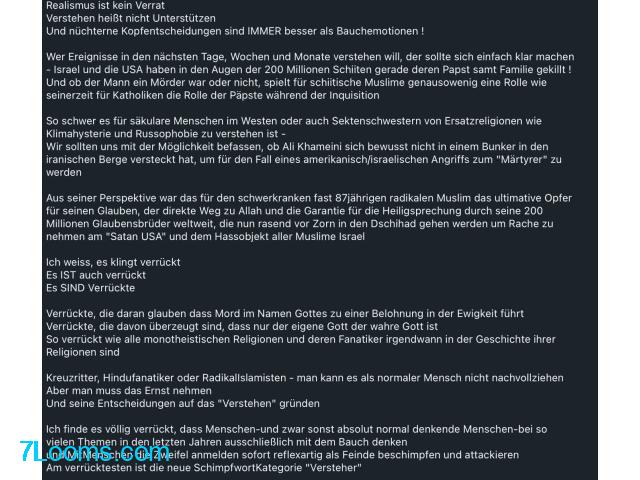 Weil ich nicht bereit bin, diesen völlig verrückten Angriffskrieg von Netanjahu und Trump auf den Iran zu bejubeln, bin ich nicht einmal ansatzweise ein "Mullahfreund"