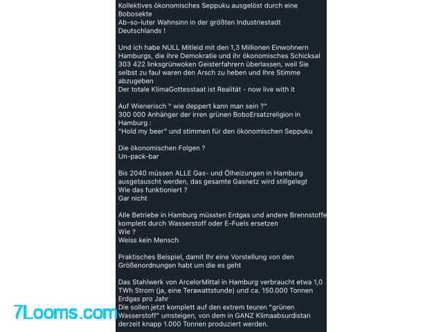Die Wohnungswirtschaft kalkuliert mit Mietsteigerungen von durchschnittlich 300 Euro, der Hamburger Hafen, einer der größten Arbeitgeber der Region, muss seine Logistikprozesse vollständig auf emissionsfreie Technologien umstellen, die es grossteils noch gar nicht gibt !