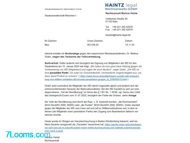 Kostenlos RA Dr. Markus Haintz: Strafanzeige gegen Söder wegen Volksverhetzung erstattet. Köln