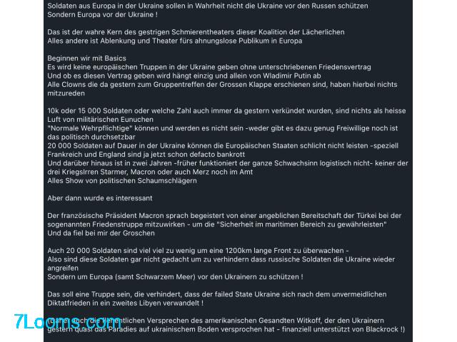 Und darüber hinaus ist in zwei Jahren -früher funktioniert der ganze Schwachsinn logistisch nicht- keiner der drei KriegsIrren Starmer, Macron oder auch Merz noch im Amt