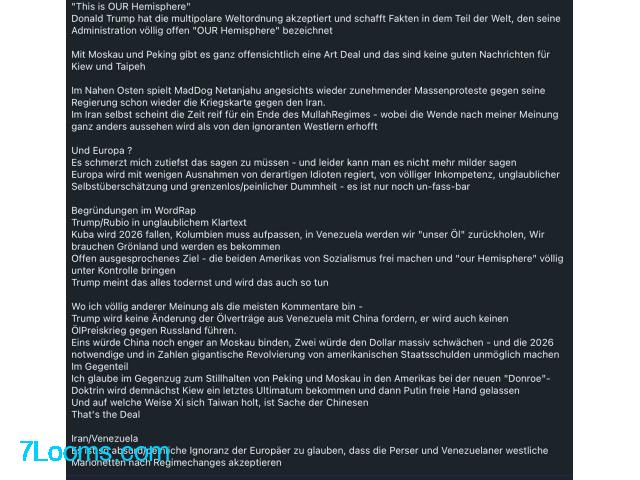 Ich glaube im Gegenzug zum Stillhalten von Peking und Moskau in den Amerikas bei der neuen "Donroe"-Doktrin wird demnächst Kiew ein letztes Ultimatum bekommen und dann Putin freie Hand gelassen