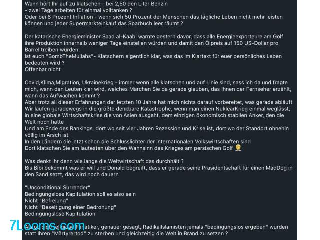 Ist euch "BombTheMullahs"- Klatschern eigentlich klar, was das im Klartext für euer persönliches Leben bedeuten wird ?