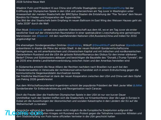 Wladimir Putin und Präsident Xi aus China sind offizielle Staatsgäste von @realDonaldTrump bei der Eröffnung der Olympischen Spiele in den USA und unterzeichnen am Tag zuvor in Washington unter Anwesenheit der meisten Staatschefs der BRICSplus Staaten die Entstehung der "Pax Terrana" dem Neuen Bündnis für Frieden und Kooperation der Supermächte