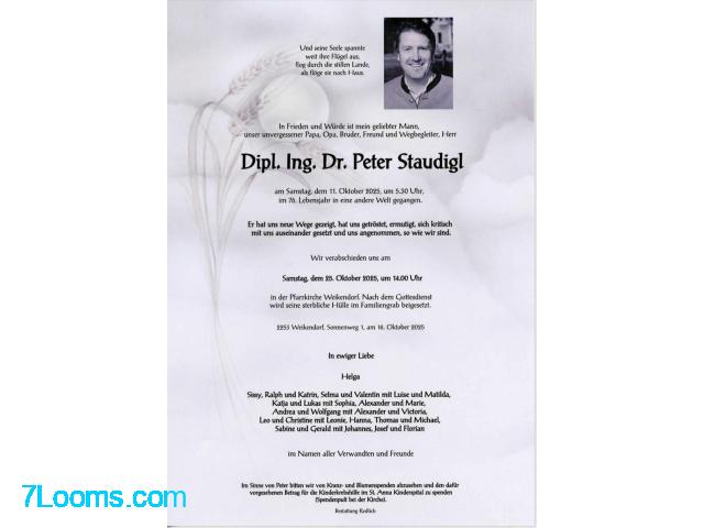 Herr Dipl. Ing. Dr. Peter Staudigl am Samstag, dem 11. Oktober 2025, um 5.30 Uhr,