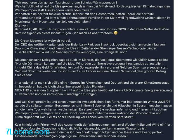 Wir hatten eine perfekt funktionierende Technik mit den Gasthermen, hatten überall die perfekte Infrastruktur dafür -und jetzt sitzen Zehntausende Familien in der Kälte weil irgendwelche Grünen Idioten im Physikunterricht Hosentaschen-Jojo gespielt haben"