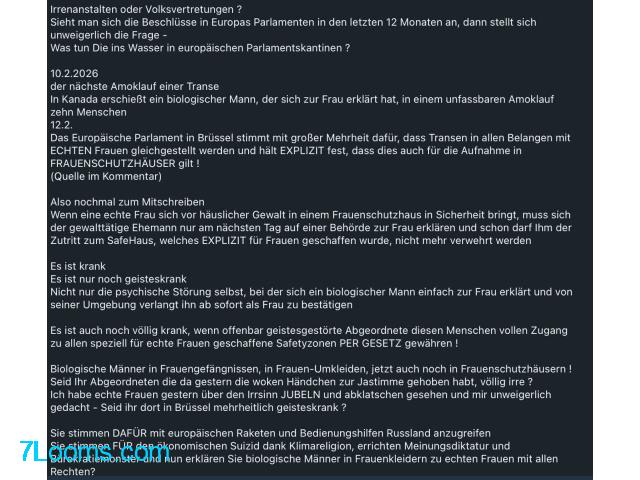 Das Europäische Parlament in Brüssel stimmt mit großer Mehrheit dafür, dass Transen in allen Belangen mit ECHTEN Frauen gleichgestellt werden und hält EXPLIZIT fest, dass dies auch für die Aufnahme in FRAUENSCHUTZHÄUSER gilt !