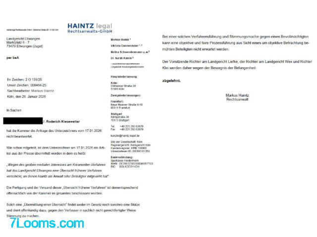 1. Wir haben gegen die Ellwanger Richter Liefke, Wex und Klei einen Befangenheitsantrag eingelegt. Diese haben der Presse sowohl meine anwaltlichen als auch privaten Rechtsstreitigkeiten am Landgericht Ellwangen vorab mitgeteilt, ohne dass hierfür eine Rechtsgrundlage bestünde oder genannt wurde.