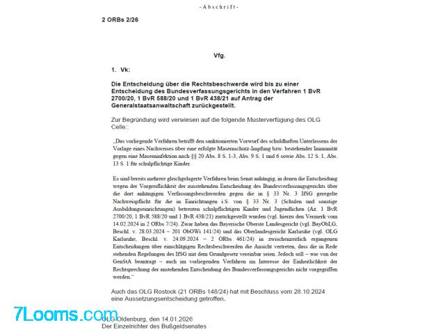 Das OLG Oldenburg hat in einem unserer Verfahren am 14.01.2026 die Entscheidung über den Antrag auf Zulassung der Rechtsbeschwerde auf Antrag der Generalstaatsanwaltschaft bis zu einer Entscheidung des Bundesverfassungsgerichts über die Masern-Impfnachweispflicht in Bezug auf Schulkinder zurückgestellt.